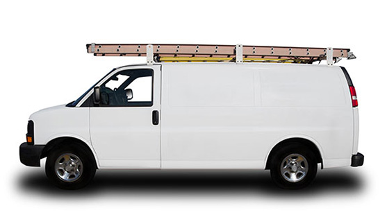 Service van with ladder rack and ladders in the rack, under 8’